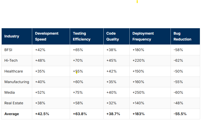 The implementation of AI accelerators creates measurable improvements across multiple delivery metrics. Organizations consistently report significant reductions in cycle times, defect rates, and resource requirements when AI tools are properly integrated into their development workflows.